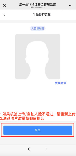 3. 生物特征采集→ 上传照片(请根据提示操作)→照片上传成功后页面拉至底端,点击“提交”