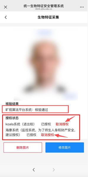 4. 采集成功如下图所示。系统默认授权校内所有应用场景,可根据自身情况逐个取消授权。