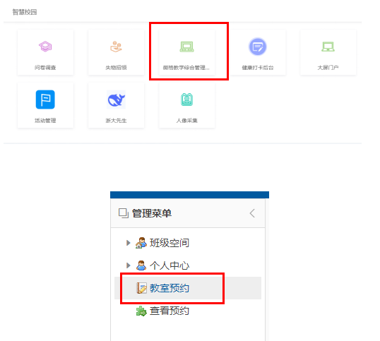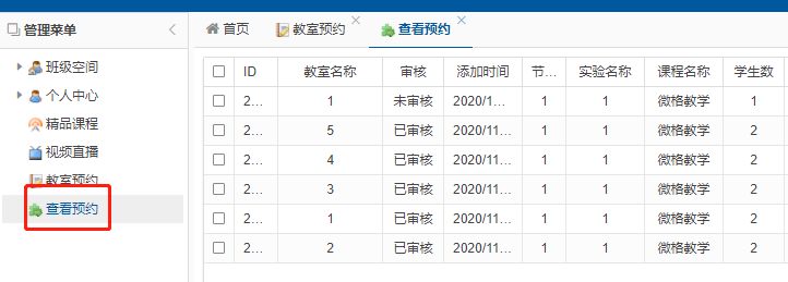 方法一:登录智慧校园—业务直通车—微格教学综合管理系统,进入资源管理平台,点击左侧菜单栏的教室预约。