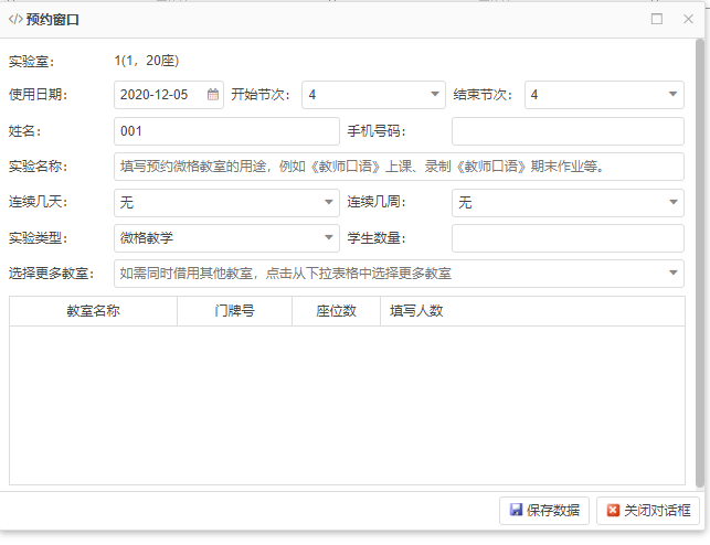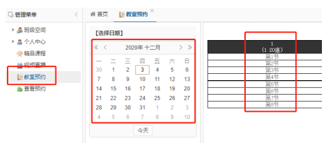2. 进入后点击教室预约,选择预约日期,选择教室和课时。